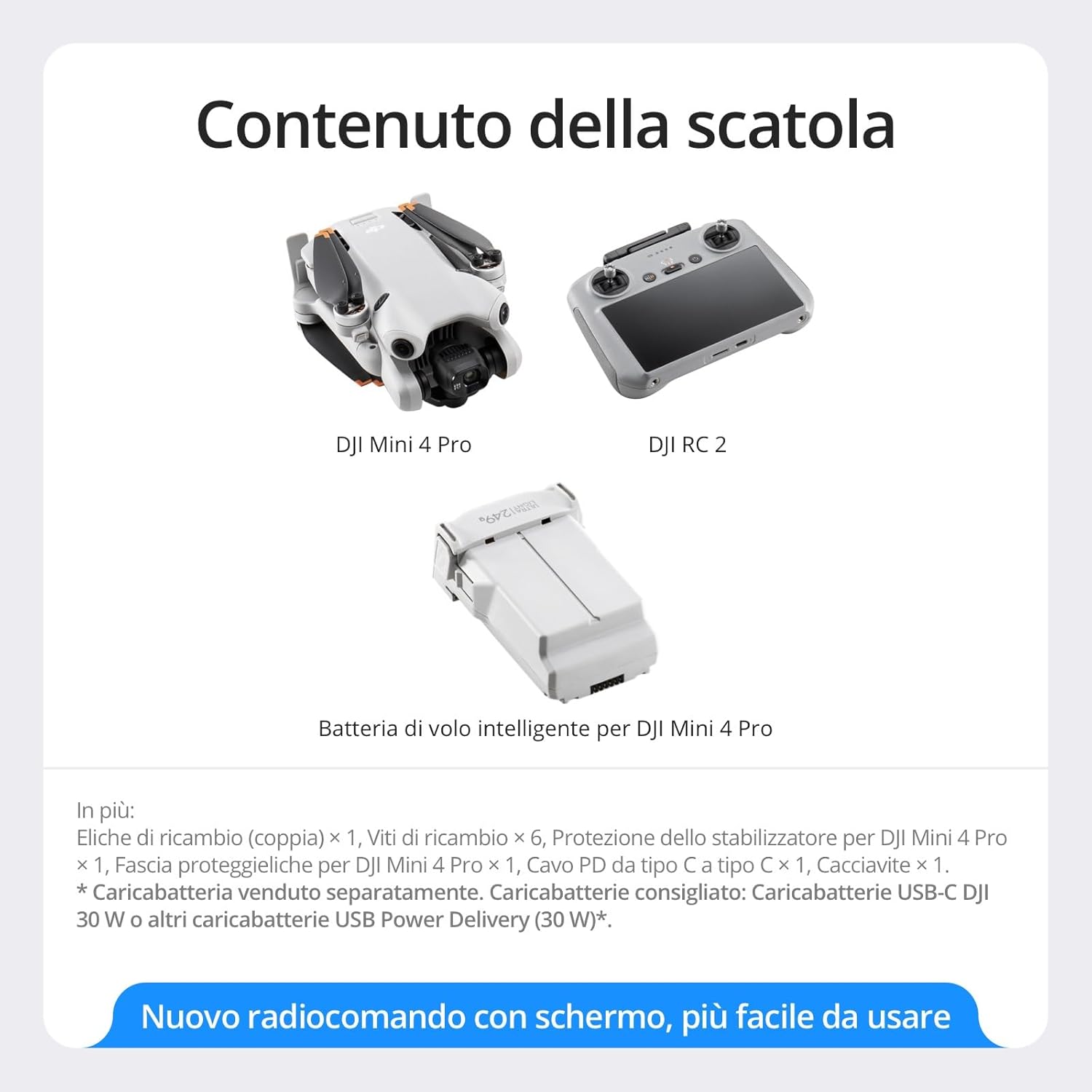 -DJI Mini 4 Pro (con DJI RC 2) include il drone, il radiocomando DJI RC 2, una Batteria di volo intelligente per DJI Mini 4 Pro e altro ancora. Ottieni un controllo preciso con DJI RC 2 e il suo schermo luminoso.