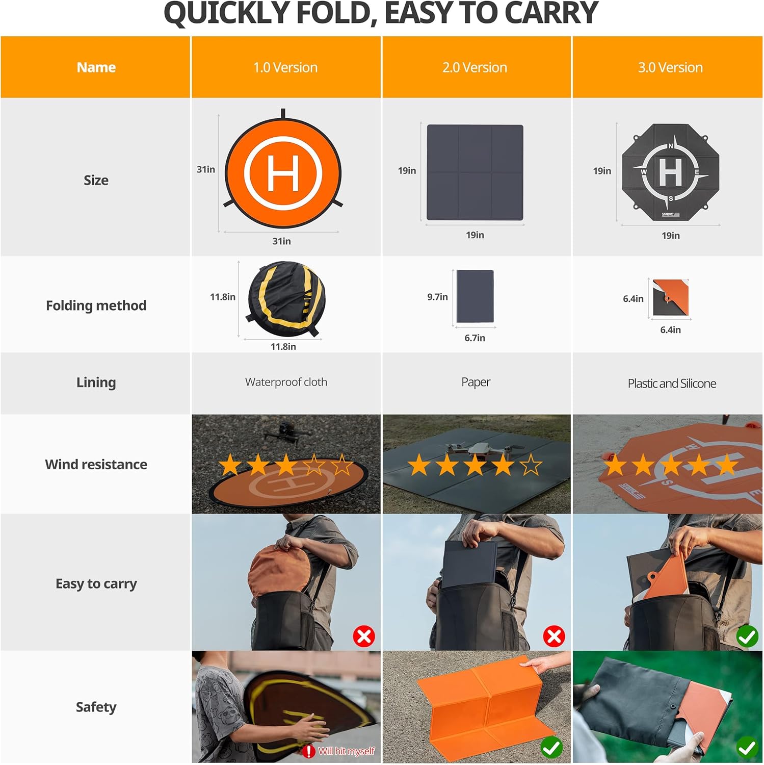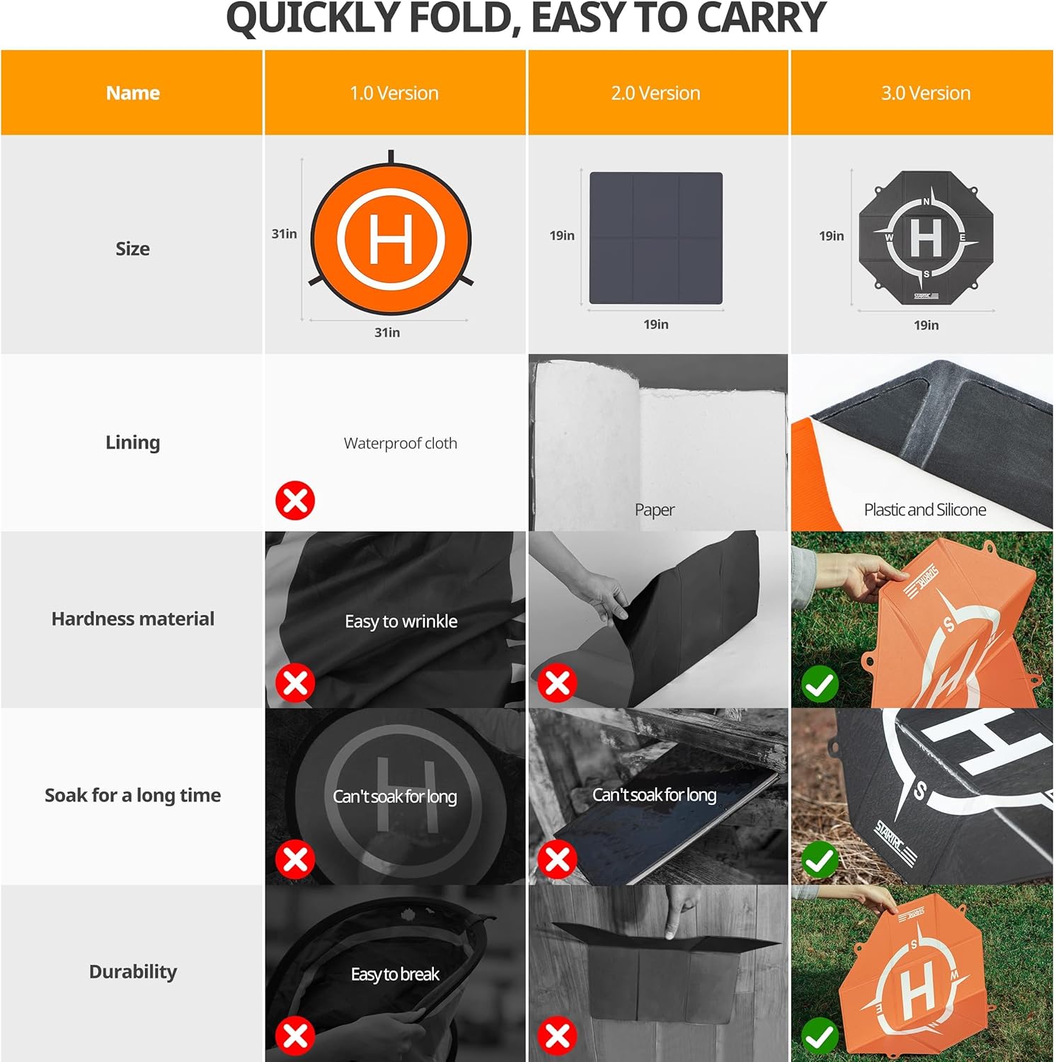 FUNCTIONAL & PORTABLE – 50 x 50cm(19″ x 19″), thanks to the simple folding, you can take it wherever you go. Help your drone find the easiest starting position, strong enough to be used on sand, overgrown grass, bumpy dirt road or snow.