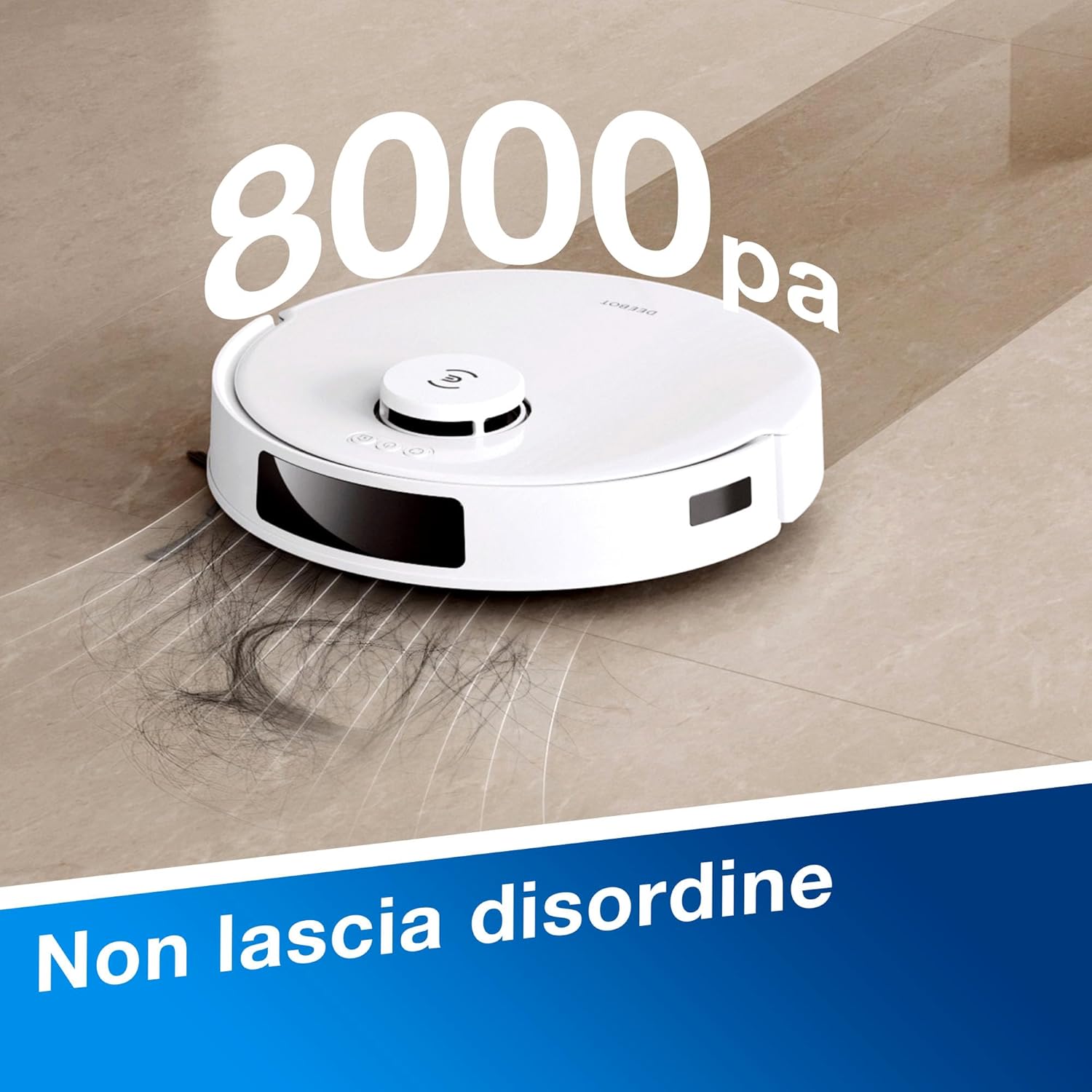 【8000 Pa di Aspirazione】La famiglia DEEBOT N20 ha un’aspirazione di 8000 Pa insieme a un contenitore per la polvere da 400 ml, garantendo una pulizia a fondo di pavimenti, tappeti e grandi superfici riducendo al minimo la frequenza di svuotamento, per un’esperienza di pulizia senza sforzo.