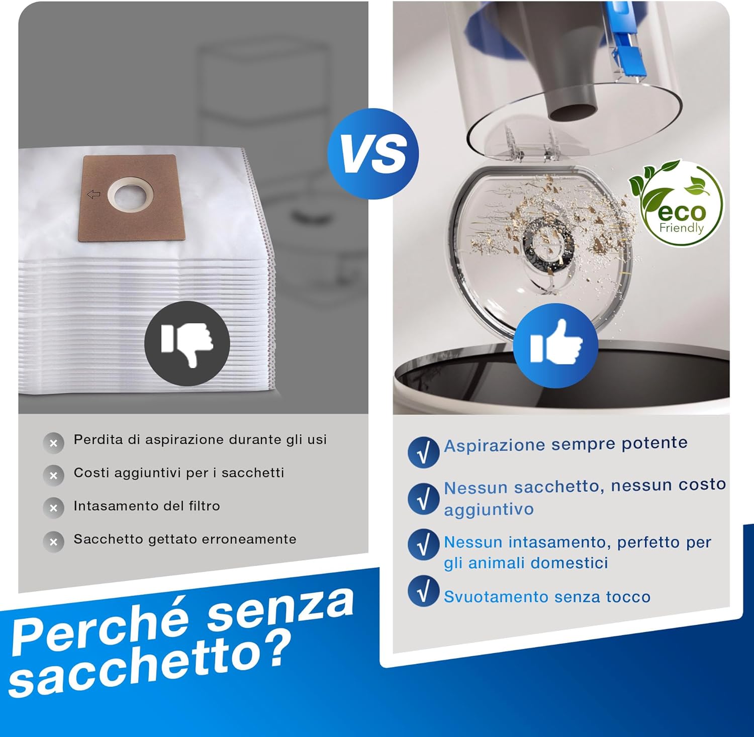 【Senza Sacchetto】Il design del contenitore della polvere senza consumabili della famiglia DEEBOT N20 promuove l’uso sostenibile, risparmiando costi e riducendo l’impatto ambientale eliminando la necessità di sostituire le buste per la polvere, mentre la sua caratteristica facilità di svuotamento e il contenitore a vista facilitano la manutenzione e lo smaltimento tempestivo dei detriti.