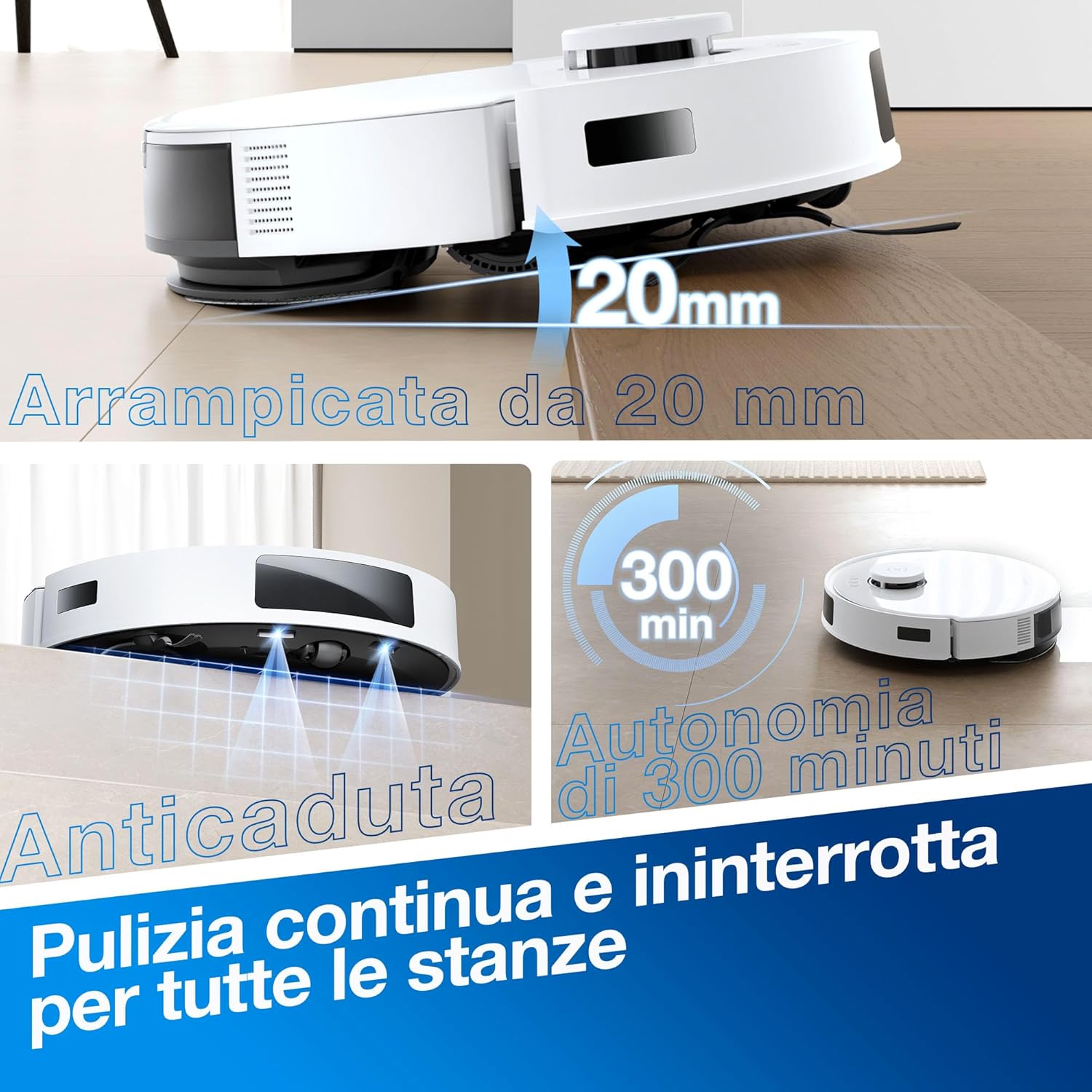 【Scalata di Soglie di 20 mm】La famiglia DEEBOT N20 utilizza ruote motrici ad alta aderenza per una movimentazione affidabile, scalando facilmente soglie di 20 mm e utilizzando algoritmi di scalata per superare intelligentemente gli ostacoli, compresi i sensori di rilevamento del tappeto per transizioni di pavimento uniformi, garantendo un’esperienza di pulizia sicura e accurata.