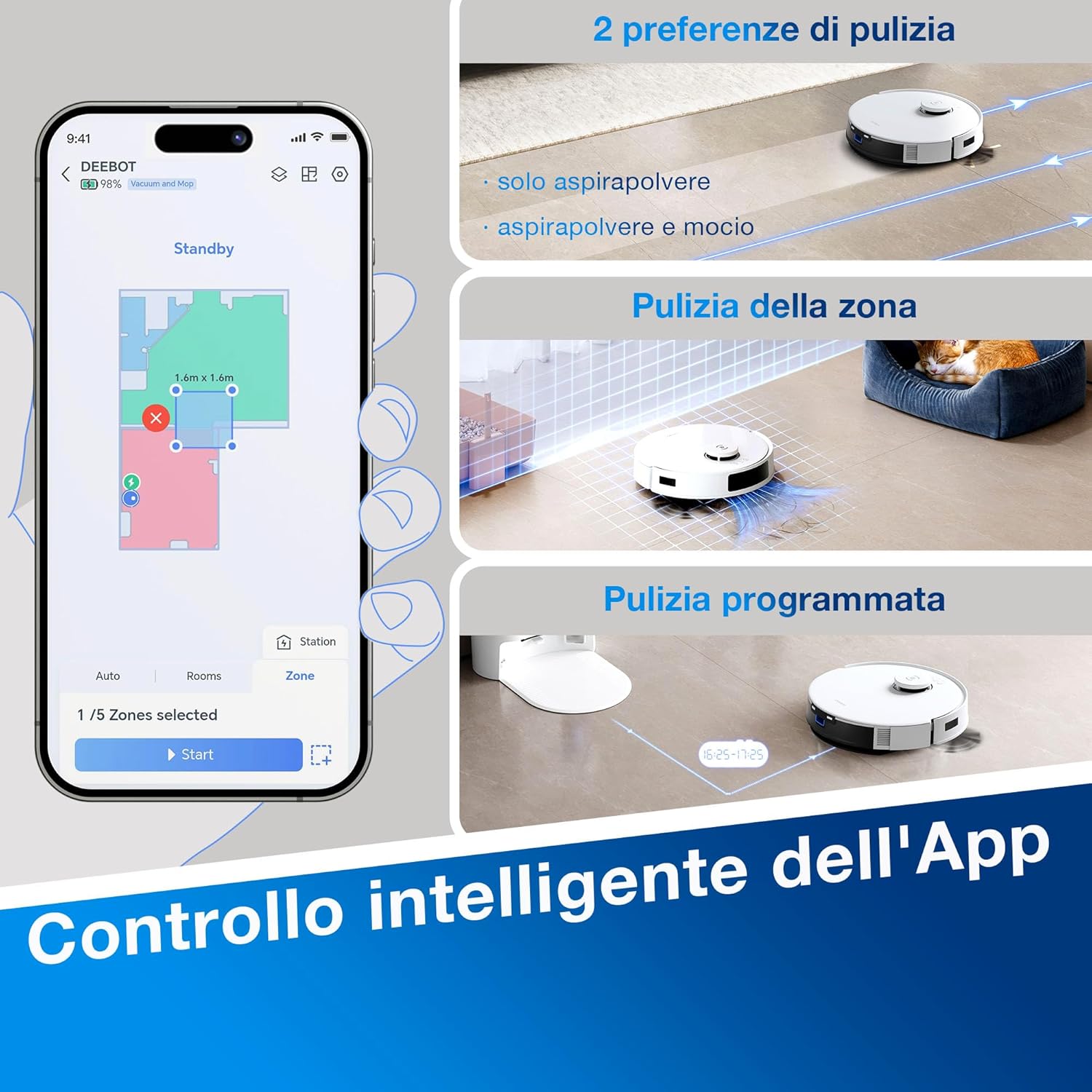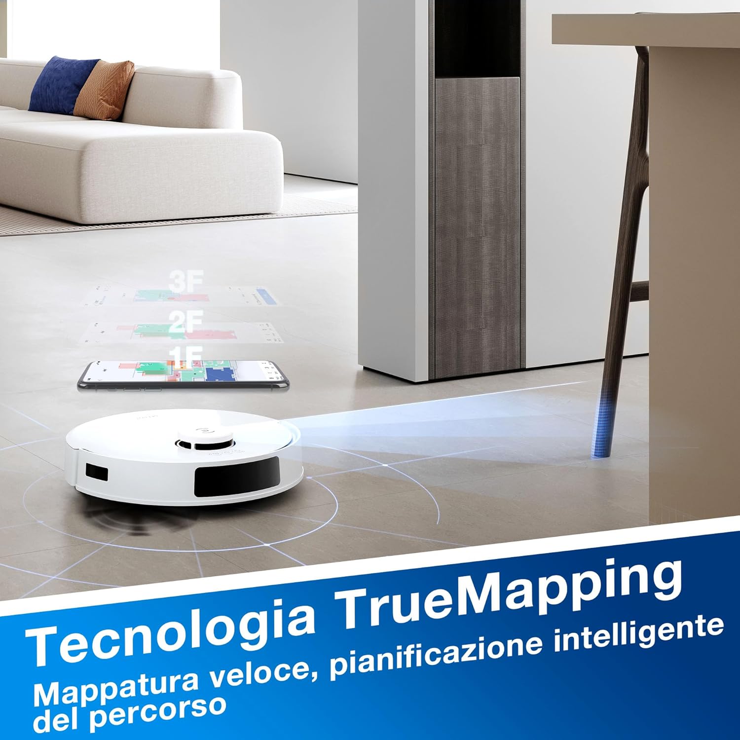【Pianificazione intelligente del percorso TrueMapping】La famiglia DEEBOT N20 utilizza la pianificazione intelligente del percorso TrueMapping, con la scansione laser radar per una navigazione precisa, garantendo una pulizia approfondita grazie alla copertura del percorso in modo sistematico. Inoltre, offre una mappatura rapida in soli 8 minuti e un pronto ripristino della mappa tramite l’App ECOVACS HOME, garantendo un’esperienza di pulizia completa e affidabile.